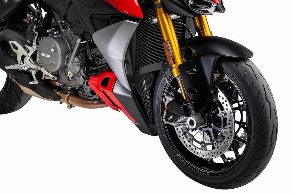 Z aerodynamického hlediska funguje Air Duct jako vzduchový kanál, který zachytává, stlačuje a směruje proud vzduchu přímo na brzdové třmeny, čímž zabraňuje přehřívání a udržuje ideální pracovní podmínky. Testy na okruhu potvrdily reálné zlepšení s průměrným snížením teploty o 10 °C, což zajišťuje stabilní výkon a přesnější pocit z brzdění.
