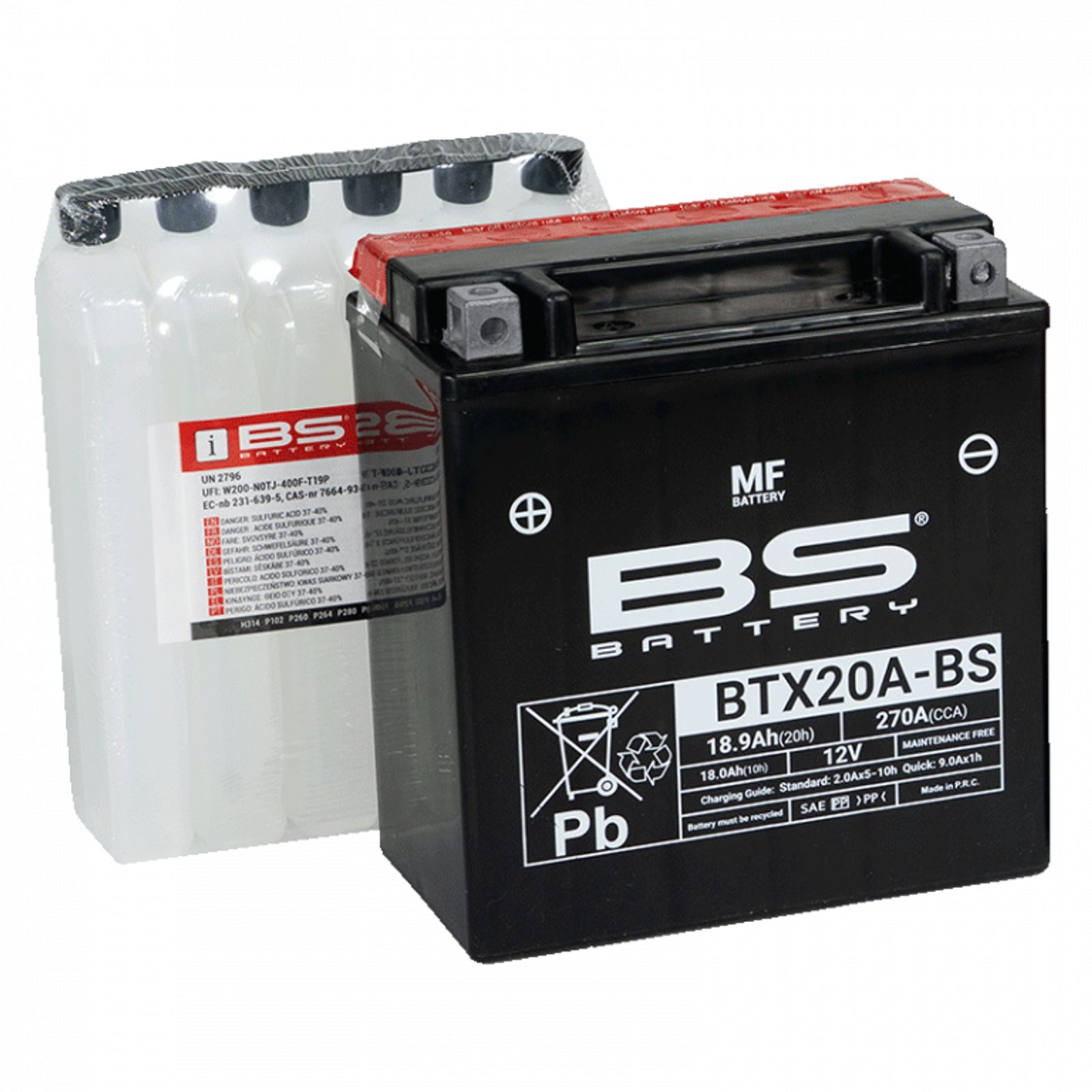 Baterie BTX20A-BS je součástí naší bezúdržbové MF řady. Tato 12V 18.9Ah baterie se dodává s balením elektrolytu (kyseliny) a před prvním použitím je nutné ji aktivovat nalitím kyseliny.