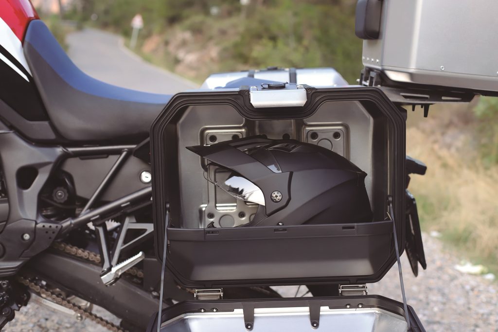 Unikátní integrovaný mechanismus zámku a madla umožňuje jednoduché ovládání jednou rukou a snadnou demontáž z motocyklu.