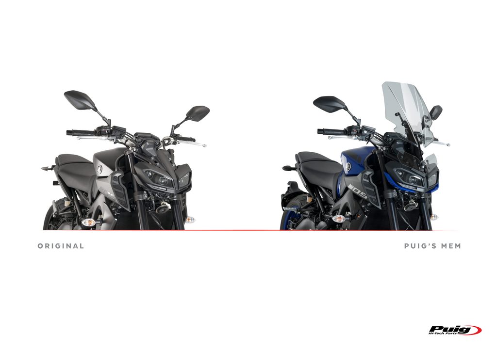 Manuální regulační systém plexiskla pro YAMAHA MT-09, který umožní posunout plexisklo až o 110 milimetrů. Dodává se s vysoce kvalitními akrylovými bočními deflektory, které zlepší aerodynamiku, ale neuškodí vzhledu MT-09. Podpěry MEM jsou vyrobeny z 2mm široké oceli s antikorozní povrchovou úpravou, což neovlivňuje jejich lehkost a design. V nejvyšší poloze činí aerodynamická ochrana 72 % (při použití plexiskla Puig Touring). Jeho montáž je jednoduchá a hotová do 15 minut.
