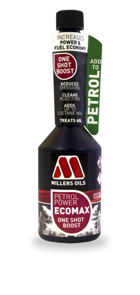 Petrol Power ECOMAX One Shot Boost Vysoce výkonná jednorázová aditivace benzínu s posíleným účinkem pro zvýšení oktanového čísla o 3 jednotky připívající rovněž k čistotě spalovacího prostoru. APLIKACE: Produkt vhodný pro všechny benzínové motory – od karburátorových po common-rail systémy. Přidejte jednorázově do nádrže před tankováním. Jedno balení 250 ml pro ošetření 60-ti litrů benzínu. UŽIVATELSKÉ VÝHODY: Zvyšuje oktanové číslo benzínu o 3 jednotky. Efektivně a v krátké době čistí vstřikovací trysky a sací ventily. Redukuje usazeniny ve spalovacím prostoru, zvyšuje čistotu pístů a sacího potrubí. Díky efektivnímu prohoření a spálení dávky paliva dochází ke snížení jeho spotřeby. Vylepšuje výkonové parametry motoru – nárůst výkonu. Chrání palivový systém před korozí a opotřebením. Přispívá k hladšímu chodu a nižší hlučnosti motoru. Zlepšuje studené starty. Razantní snížení emisí a kouřivosti (uhlovodík, oxid uhličitý a oxidy dusíku). Ochraňuje a zlepšuje efektivitu katalyzátoru. Plně kompatibilní se všemi bezolovnatými benzíny. Ideální prostředek k vyčištění spalovacího prostoru motoru před měřením emisí při technické kontrole vozidla. Vyvinuto, vyrobeno a baleno v Anglii - originál firmy Millers Oils Ltd. CHARAKTERISTIKA: Hustota při 15°C: 0.840 Kinematická viskozita při 40°C: 2.5 cSt Bod vzplanutí: 66°C Barva: světle hnědá Skladujte mimo přímé sluneční záření a zdroje tepla. BALENÍ: Láhev 250 ml
