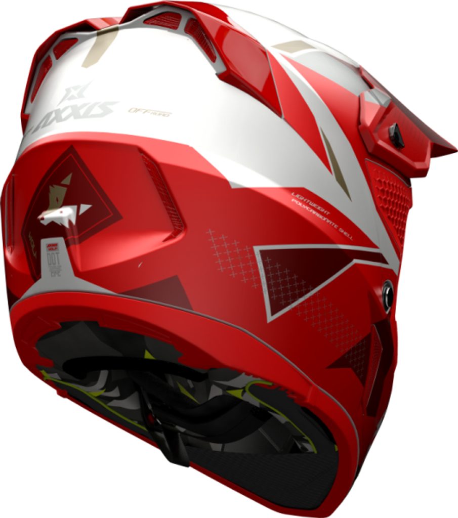 Přilba AXXIS WOLF vyniká atraktivním designem, robustní konstrukcí a je zaměřena na maximální ochranu a pohodlí motokrosového jezdce. Skořepina je vyrobena z ABS ve dvou velikostech. Díky tomu je možné zachovat u menších velikostí nižší hmotnost. WOLF váží ve velikostech XS-M pouhých 1400 ± 50 g a ve velikostech L-2XL 1500 ± 50 g.