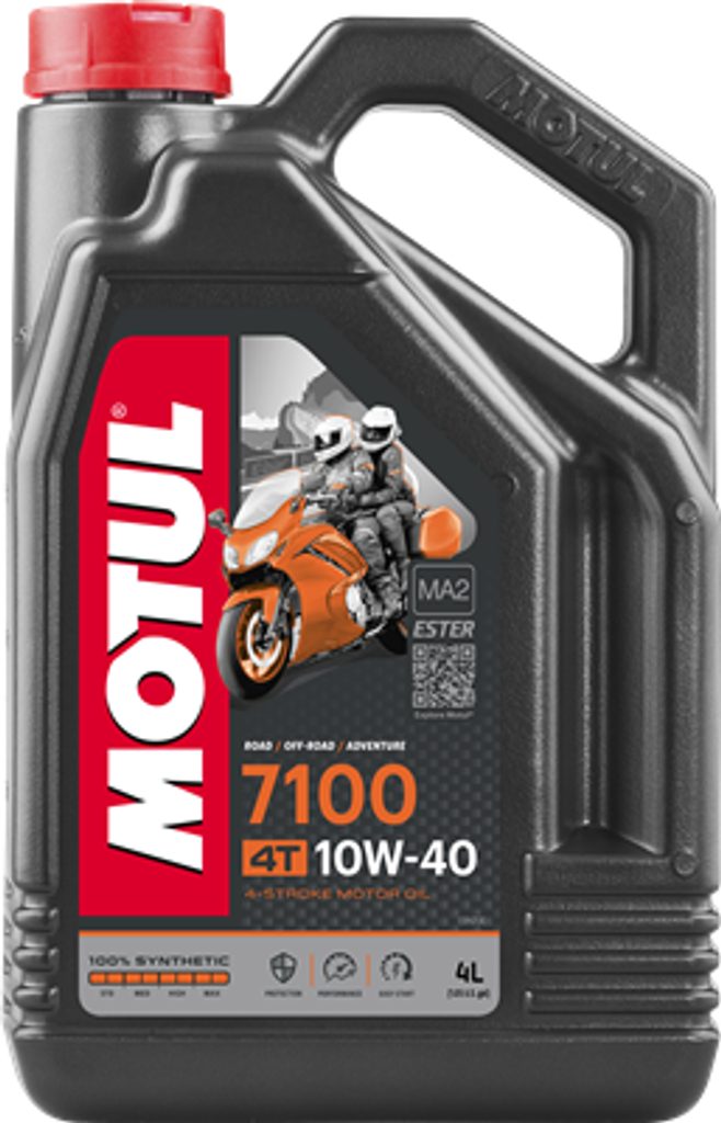 Motorový olej Motul 7100 4T 10W-40, 4LPlně syntetický olej určený pro provoz moderních čtyřdobých motorů motocyklů. Olej je vyroben esterovou technologií pro použití ve společných naplních: motor převodovka a spojka. Výborně maže třecí části motoru a převodovky, zabraňuje prokluzu spojky, vykazuje chemickou stálost, nepěnivost a antioxidační vlastnosti. Plně vyhovuje požadavkům všech výrobců motocyklů.Parametry: Motorový olej Motul 7100 4T 10W-40, 4LTyp oleje syntetickýPoužití oleje motorový olejTakt 4 taktSpecifikace APISG/SH/SJ/SL/SM/SNSpecifikace JASOMA2SAE 10W-40Objem balení 4 litr
