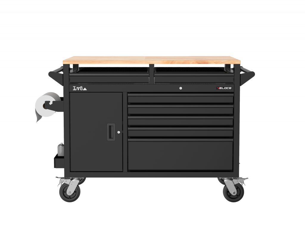 Multifunkční pojízdný dílenský stůl – délka 1200 mm. Robustní pracovní stůl na kolečkách s dřevěnou pracovní deskou, 14 zásuvkami, dvojitým úložným prostorem s dvířky a oboustranným perforovaným panelem na nářadí a příslušenství. Ideální vybavení pro náročné motorkáře i profesionální servisy.