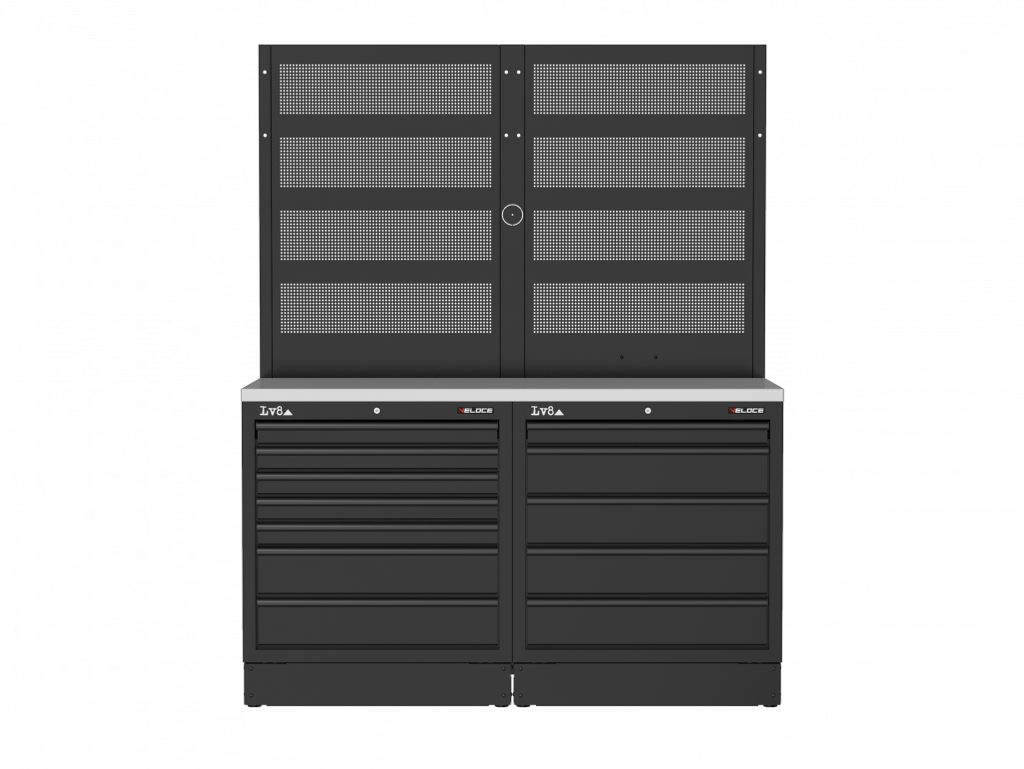 Pracovní stůl délky 1600 mm s dvěma skříňkami – 7 a 5 zásuvek se zámkem. Robustní a praktický stůl s masivní dřevěnou pracovní deskou, dvojitým perforovaným panelem na nářadí a připraveností pro připojení elektrické zásuvky. K dispozici také v provedení s nerezovou nebo melaminovou deskou.