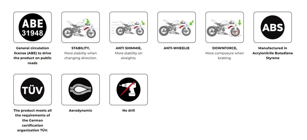 Montáž je jednoduchá a rychlá, bez nutnosti speciálních mechanických znalostí, protože spoiler je upevněn k motocyklu pomocí 3 mm silného kovového držáku.