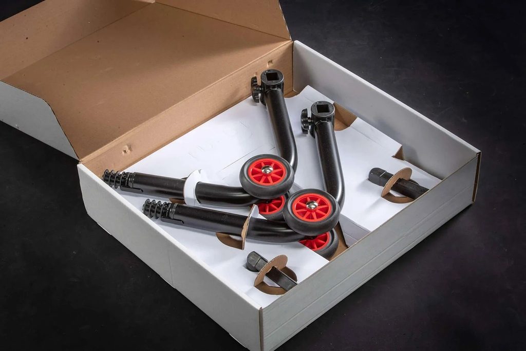 Patentovaný zadní stojan na motorku dodávaný ve třech snadno montovatelných dílech - lze ho sestavit bez použití šroubů a šroubováků.