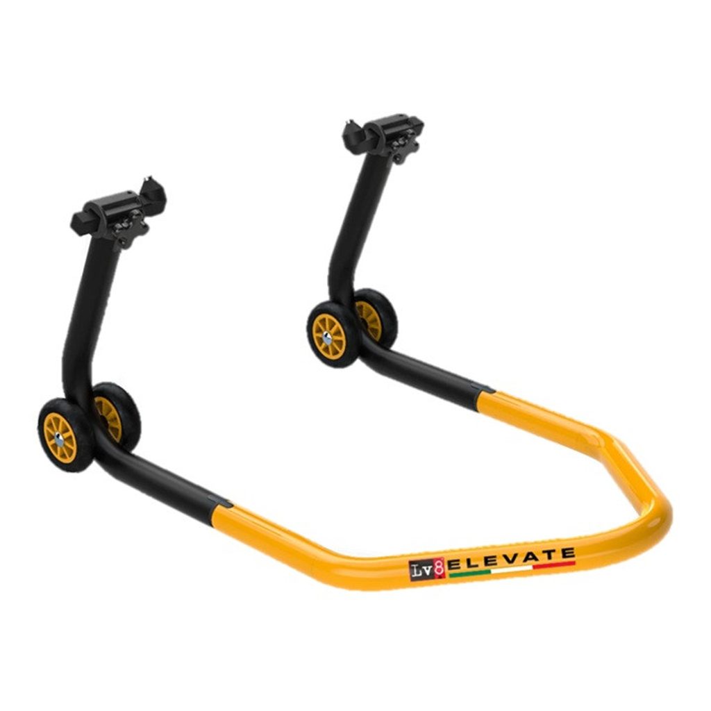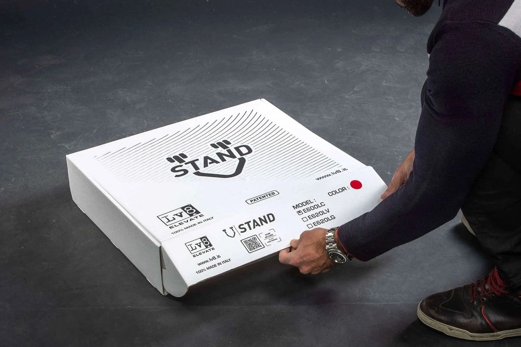 Patentovaný zadní stojan na motorku dodávaný ve třech snadno montovatelných dílech - lze ho sestavit bez použití šroubů a šroubováků.