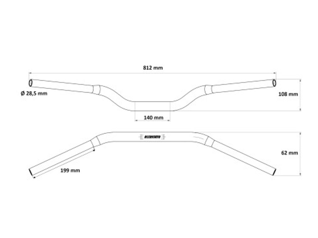 Technické údaje: Průměr: 28,5 mm – Délka: 812 mm – Výška: 108 mm – Délka střední části: 140 mm – Úhel náklonu: 62 mm – Materiál: hliník.