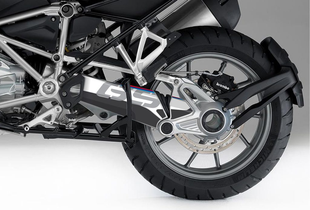 Bílý chránič kyvné vidlice, určený pro BMW R1200GS. Pomáhá ochránit kyvnou vidlici proti nečistotám a poškrábání způsobeným vlivem jízdy. Je odolný proti slunečnímu záření a díky technologii zadního potisku je motiv dlouhotrvající a odolný vůči poškrábání.