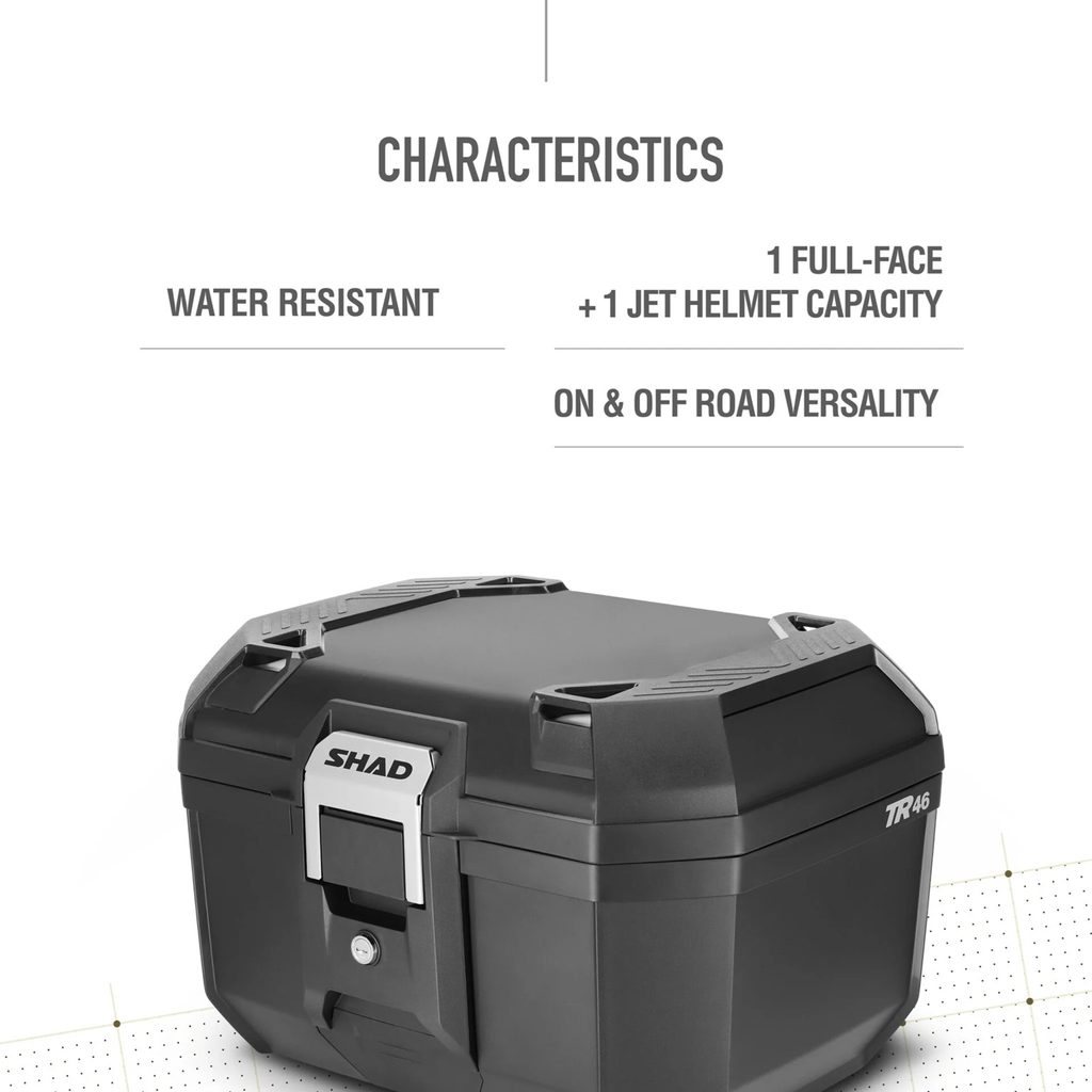 TR46 je odolný kufr navržený pro dobrodružství. Díky vysoce pevným materiálům a zesílené konstrukci základny spolu s horními rámy a centrální strukturou těla se jedná o pevný a robustní horní kufr. Obsahuje nerezový zámek s integrovanou rukojetí. S kapacitou pro dvě helmy (integrální a JET) unese maximální zatížení 6 kg.